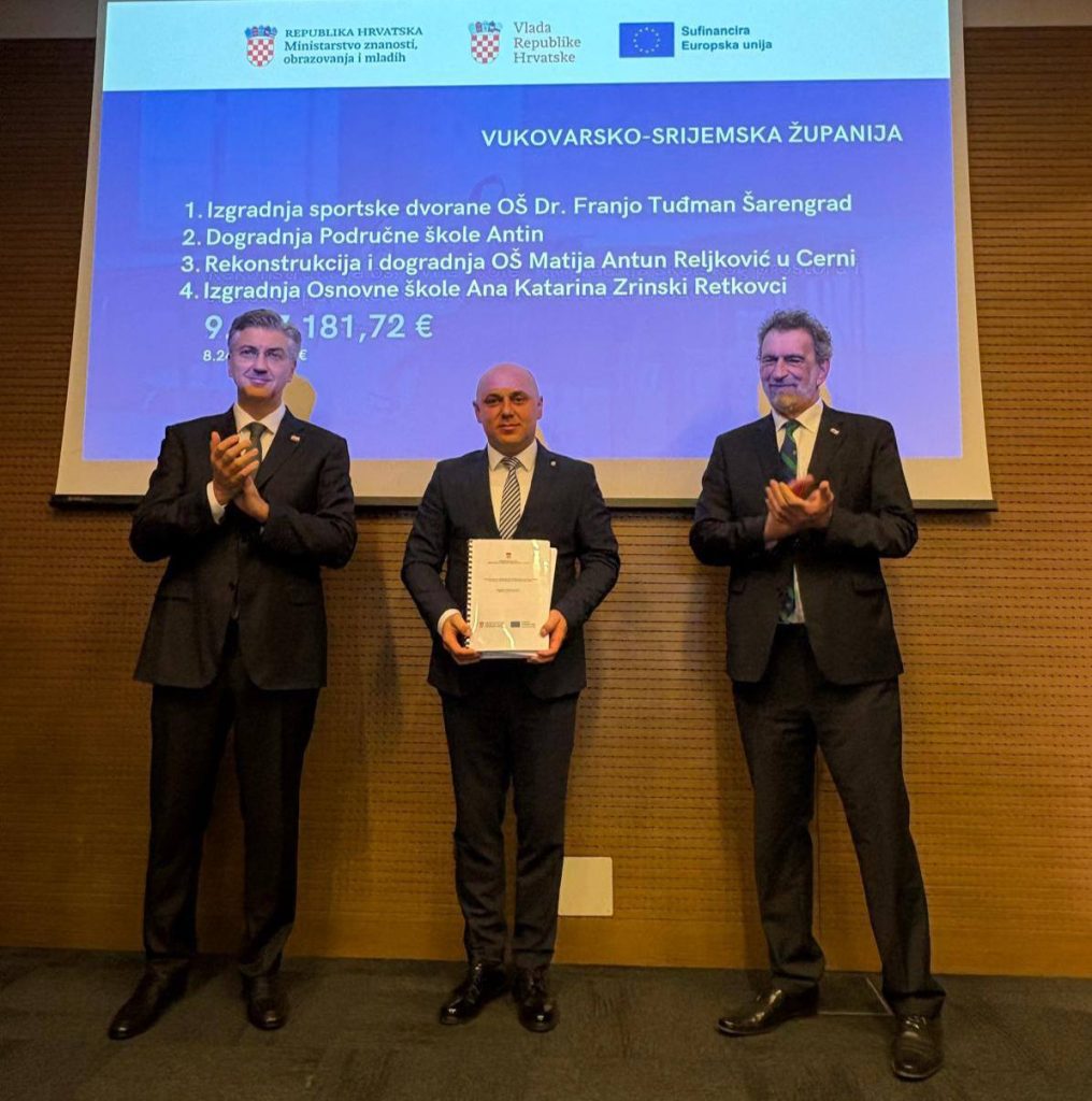 Kreću projekti koji će trajno promijeniti obrazovnu sliku županije: Antin – dogradnja područne škole, Cerna – rekonstrukcija i dogradnja OŠ Matije Antuna Reljkovića, Šarengrad – nova sportska dvorana uz OŠ „dr. Franjo Tuđman“, OŠ Bršadin – rekonstrukcija i dogradnja škole te izgradnja sportske dvorane.