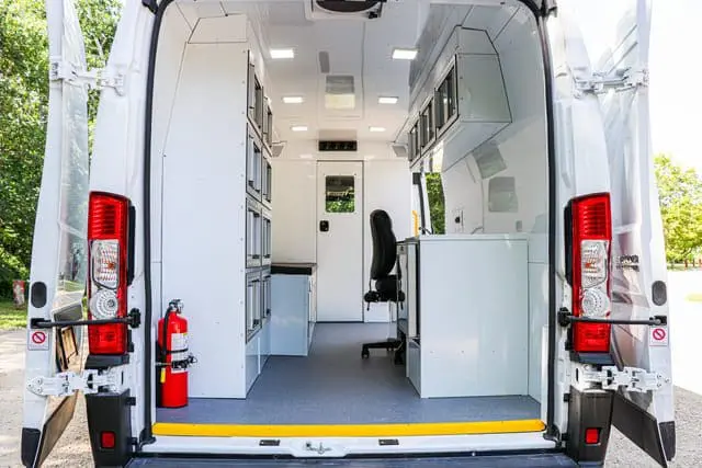 Unutarnji prostor sadrži radni stol, prijenosna računala, hladnjak za lijekove, ležaj za pregled te sve potrebne medicinske uređaje – od EKG-a i defibrilatora do osnovnih instrumenata i lijekova.