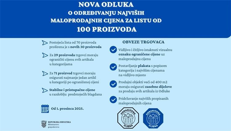 Vlada Republike Hrvatske usvojila je na današnjoj sjednici Odluku o određivanju najviših cijena određenih proizvoda i određenih kategorija proizvoda kao mjera izravne kontrole cijena u trgovini na malo. Novom Odlukom uređuje se popis za ukupno 100 proizvoda i kategorija proizvoda s najvišom razinom maloprodajnih cijena u trgovini na malo. Nova Odluka donosi se s ciljem dodatne pomoći najugroženijim građanima.