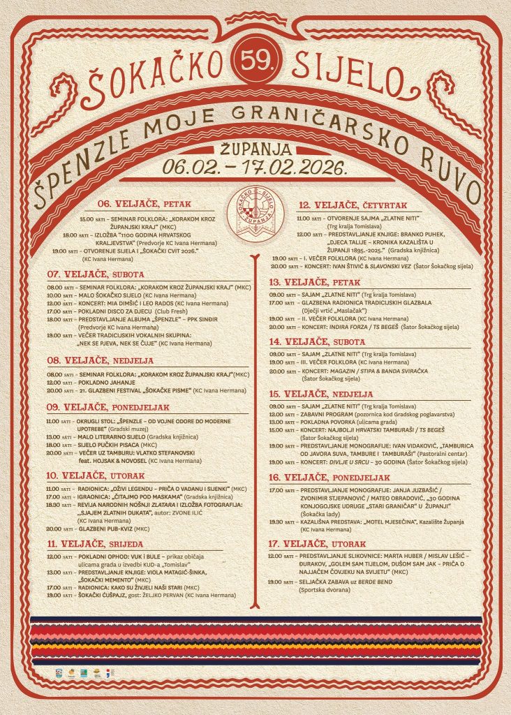 Pod motom “Špenzle moje graničarsko ruvo”, u razdoblju od 6. do 17. veljače županjskim ulicama čut će se topot kopita, zveckanje dukata, pocikivanja divojaka, momaka, snaša i baća. Čuvari tradicije kroz priredbe Sijela oživjet će nekadašnje običaje i sve ono što im je ostavljeno kao trajni zalog ovdašnjeg čovjeka.