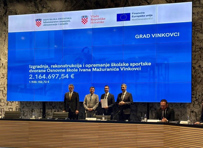 Gradonačelnik Josip Romić danas je u Zagrebu potpisao ugovor za “Izgradnja, rekonstrukcija i opremanje školske sportske dvorane Osnovne škole Ivana Mažuranića Vinkovci“.