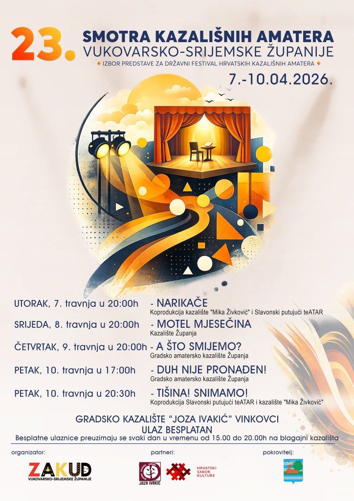 U organizaciji ZAKUD-a Vukovarsko-srijemske županije, od 7. do 10. travnja 2026. u Gradsko kazalište Joza Ivakić održat će se 23. Smotra kazališnih amatera Vukovarsko-srijemske županije, manifestacija koja iz godine u godinu okuplja najaktivnije kazališne skupine s područja županije i donosi uvid u njihovu aktualnu produkciju.